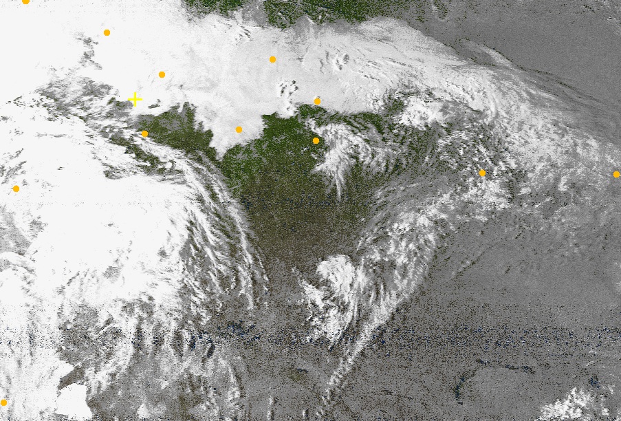 Именно получение этого изображения могли наблюдать в прямом эфире участники встречи 12 апреля 2012 года в читальном зале библиотеки УлГУ. Андрей не хотел его выставлять, так как по его мнению, снимок получился неудачным, слишком далеко пролетал спутник от его антенны. Но мы не стали заменять более качественным снимком, полученным в этот же день, но в другое время.