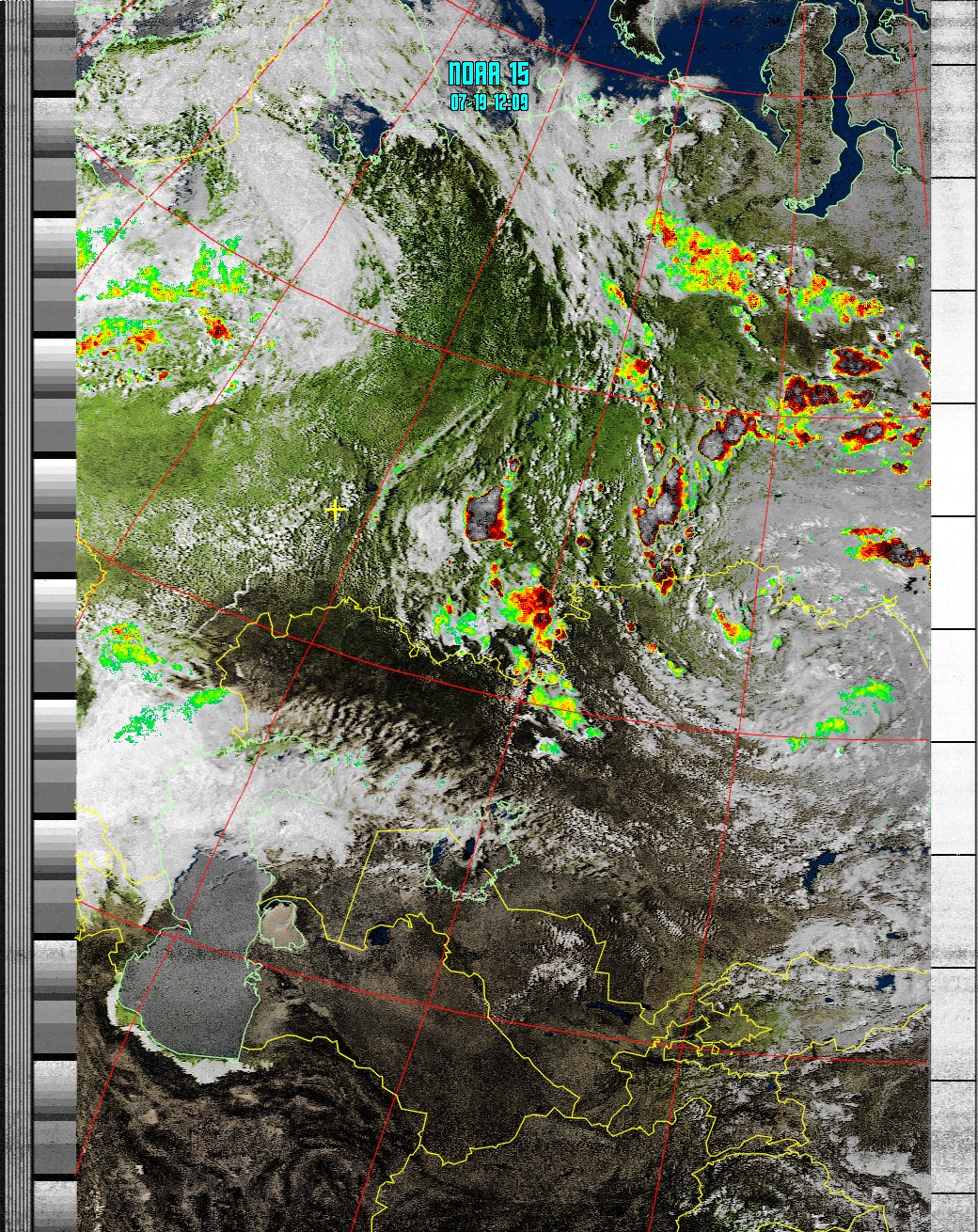 NOAA-15 (MSA with precipitation) Мультиспектральный анализ облачности с областями метеоактивности