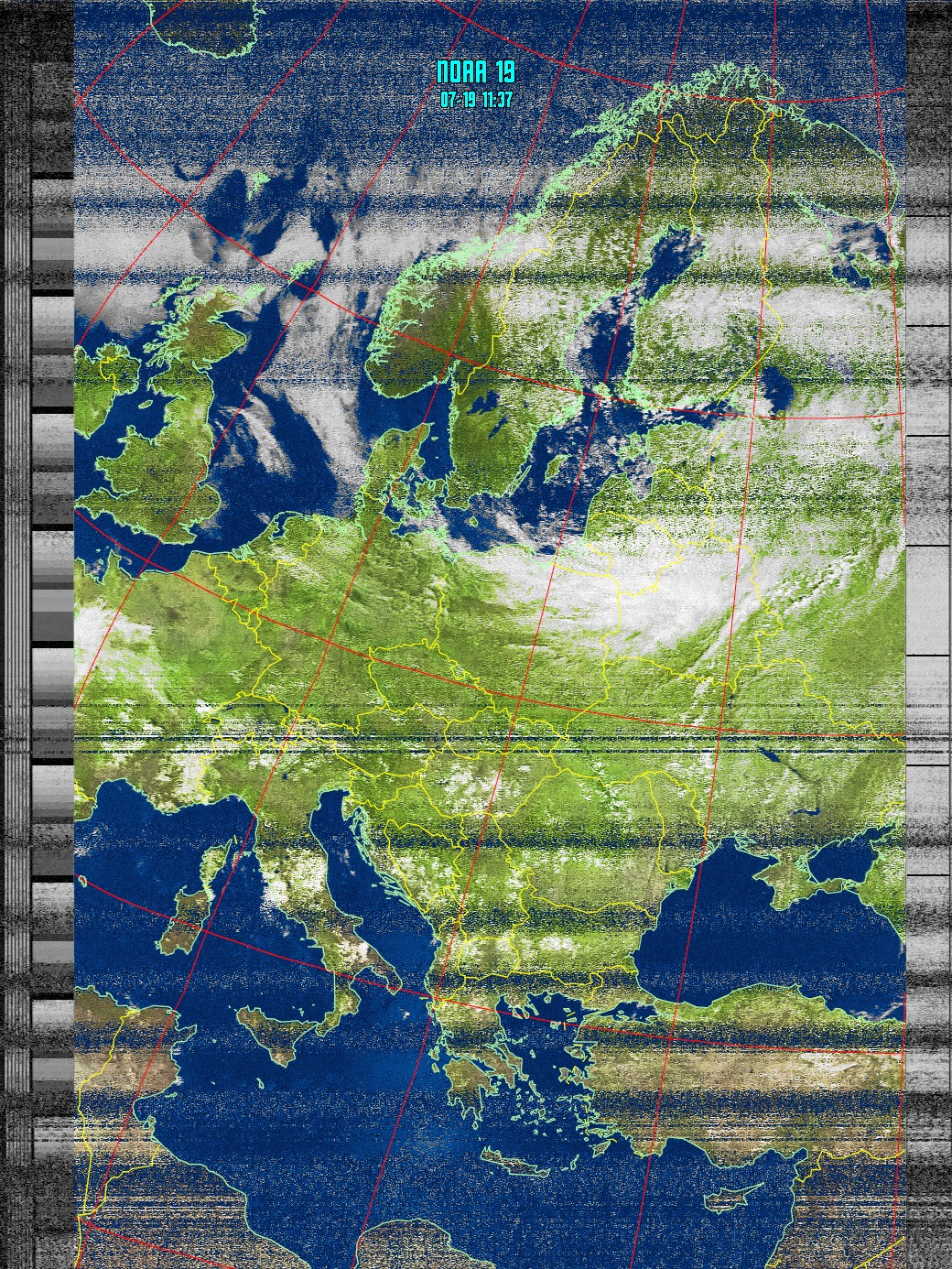 Полное изображение. Получено на малых углах возвышения с больши уровнем шума. Видна почти вся Европа .