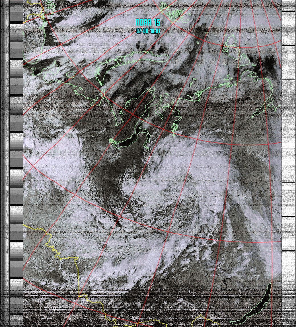 Снимок сделан при очень малых углах возвышения спутника на востоке. Редкий случай внизу справа снимка виден Байкал. К сожалению на таких малых углах (около 10 гад над горизонтом) изображение содержит много шума