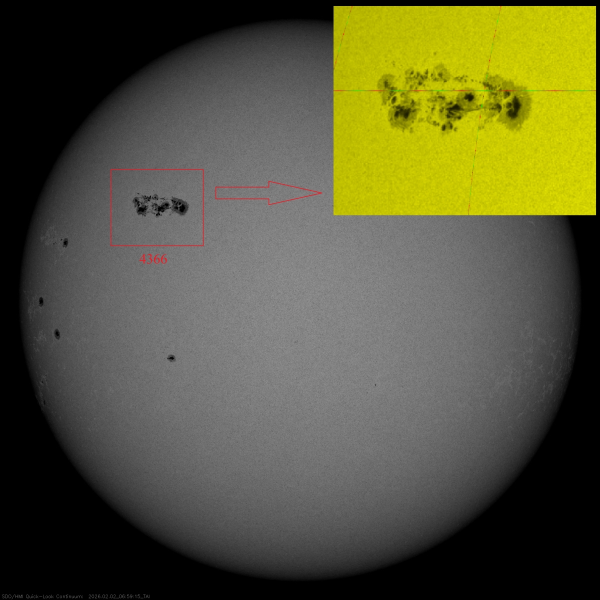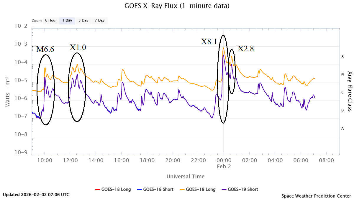 1.02.2026 года на Солнце произошли серии солнечных вспышек в одной группе черных пятен 4266. Солнечные вспышки с мощностью M 6,6 (UTC 10:02 1.02.26 г.), X 1,0 (UTC 12:34 1.02.26 г.), X 8,1 (UTC 23:50 1.02.26 г.), X 2,8 (UTC 00:36 2.02.26 г