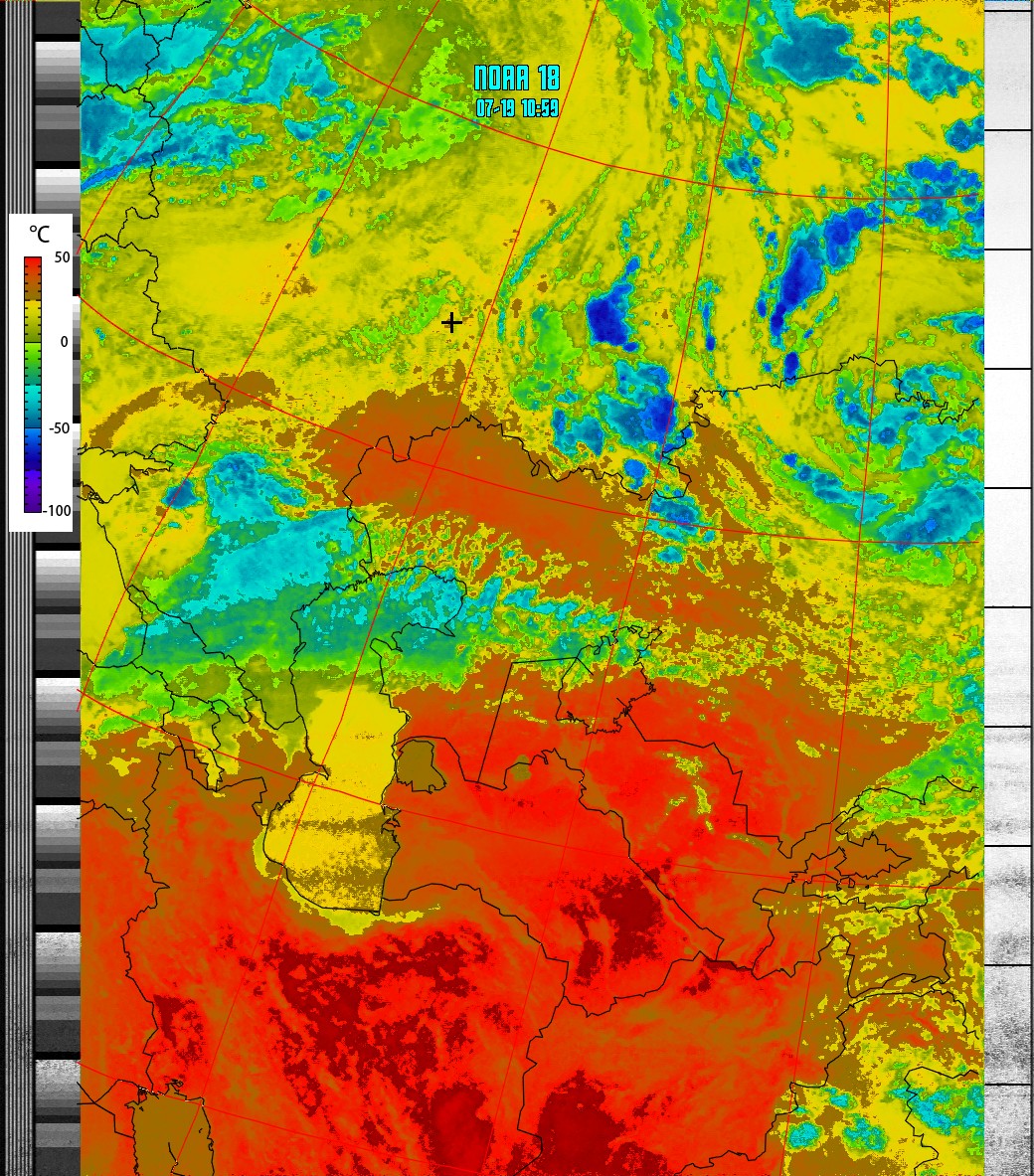 На данном снимке, полученном со спутника 19 июля в 14 час. 58 мин. по моск. времени можно проанализировать температуру на поверхности Земли в различных участках. При приёме этого снимка сразу был замечен необычный цвет. После расшифровки оказалось, что на территории южнее Каспийского моря (с помощью политической карты можно установить, что это Иран, Туркмения, Афганистан) температура достигает 57-61 градусов жары!