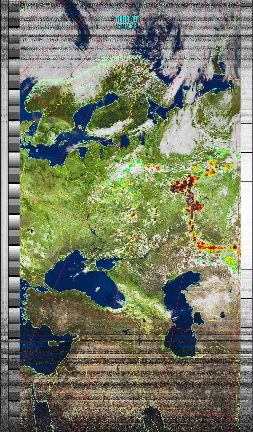 Полный снимок. Снимок получен на относительно малых углах возвышения в максимуме не более 40 град. На юге видны Красное море и Персидский залив. На севере и юге на малых углах возвышения виден шум. Участки шума на следующих снимках убраны.