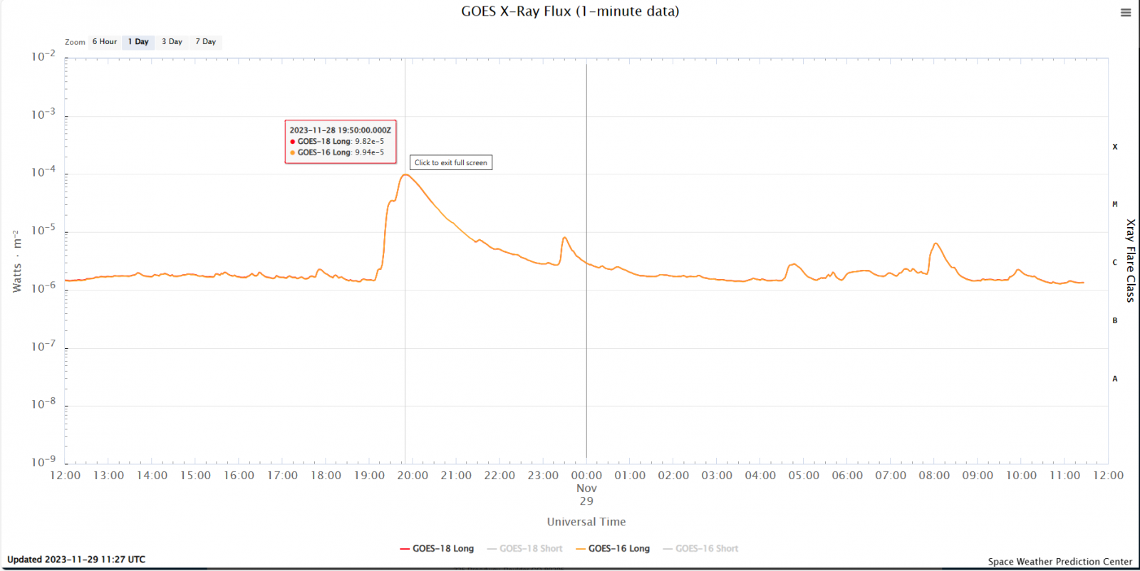 Здравствуйте. В 19:50 UTC 28.11.2023 года произошла сильная вспышка на Солнце в группе черных пятен 3500. Класс вспышке мощности M9.94 (9.94*10-5 Вт*м-2)