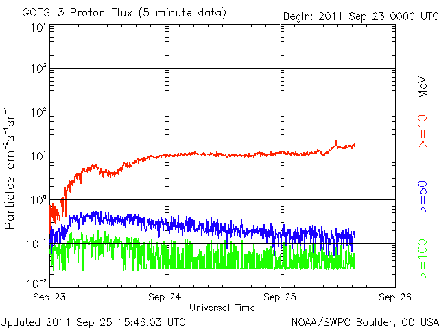 В результате повышенной солнечной активности последних дней количество энергичных протонов около Земли увеличилось в 100 раз (!):