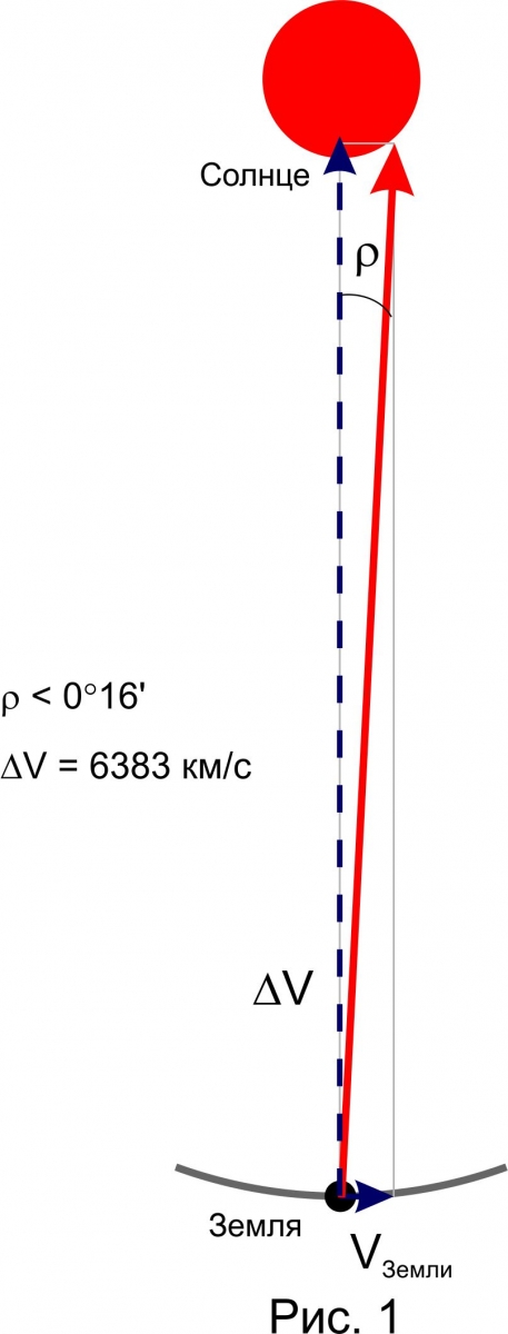 Чтобы тело двигалось самостоятельно, его надо запустить с Земли с гиперболической скоростью. Тогда при пересечении границы сферы действия Земли относительно Солнца, оно сохранит остаточную скорость DV. Эта скорость геометрически сложится со скоростью, которую тело сохраняет, двигаясь по инерции вместе с Землей по орбите, поэтому его орбита относительно Солнца будет отличаться от земной. Угловой радиус Солнца, видимый с Земли, всего 0 градусов 16 минут. Чтобы брошенное тело попало на Солнце, угол между направлением на центр Солнца и результирующей скоростей rдолжен быть меньше углового радиуса Солнца (см. рис. 1). Из этого следует, что значение DVдолжно быть равно 6383 км/с!