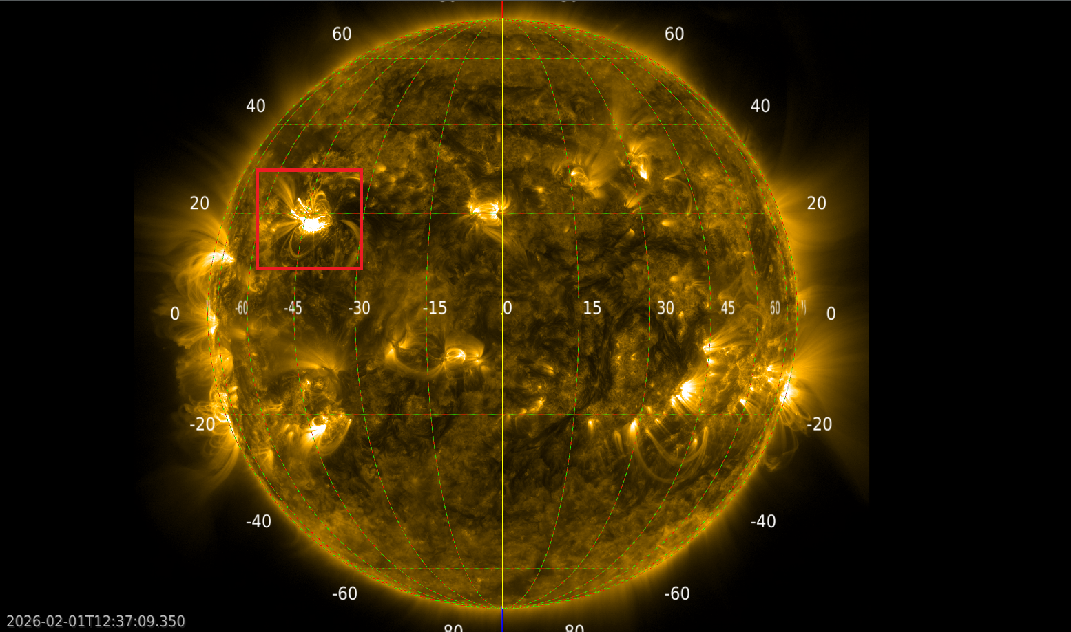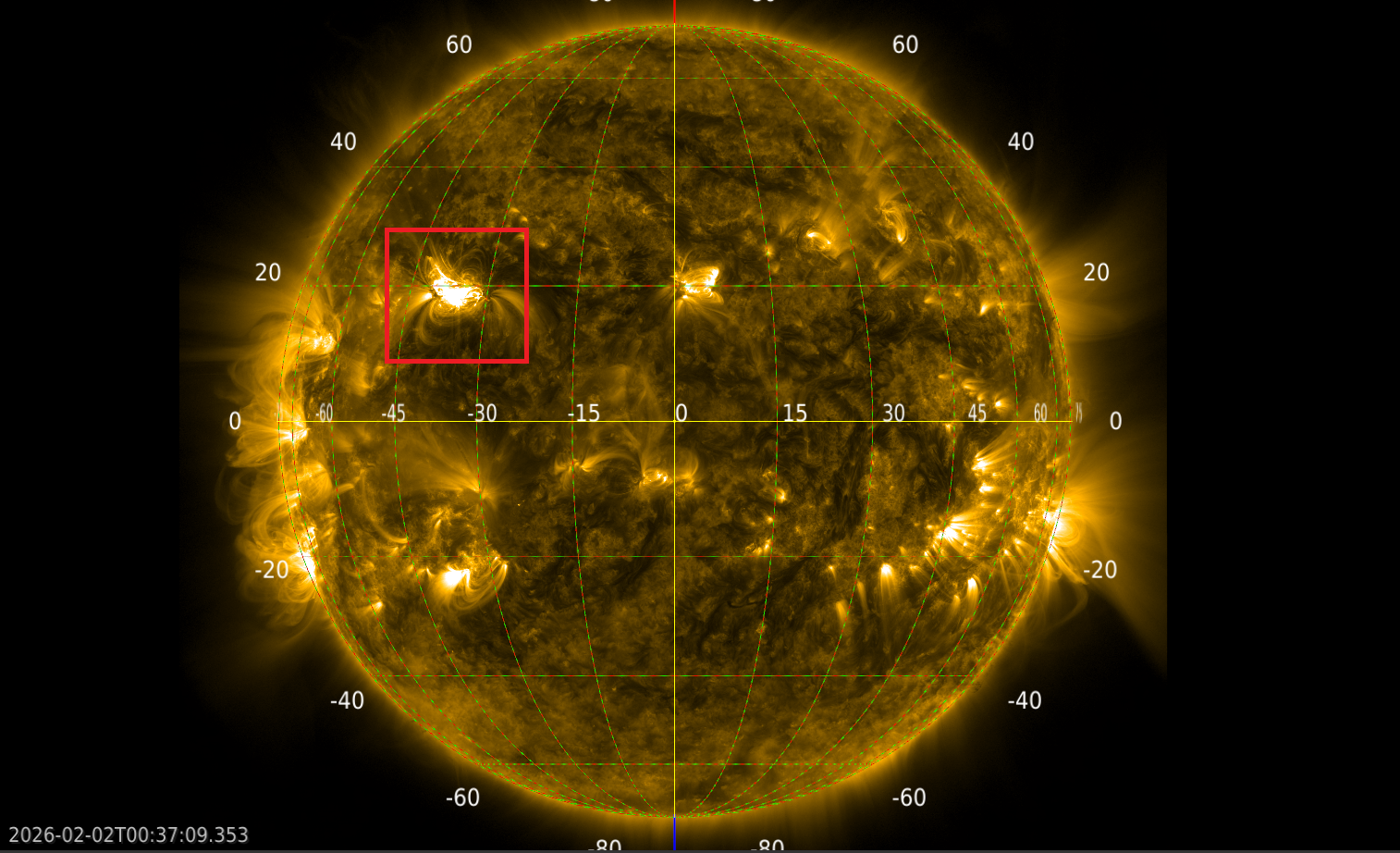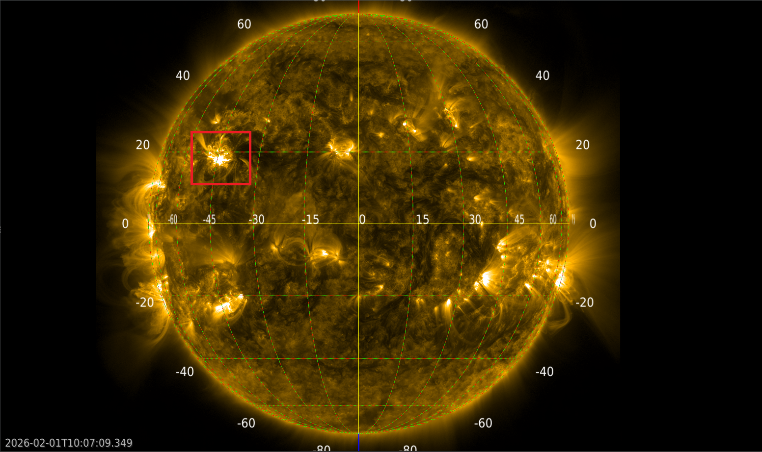 Снимок солнечного диска со спутника SDO с применением фильтра AIA 171. На снимке отмечена область в момент солнечной вспышке класса X. Солнечная вспышка произошла почти на экваторе Солнце и -20 градусов от нулевого меридиана.