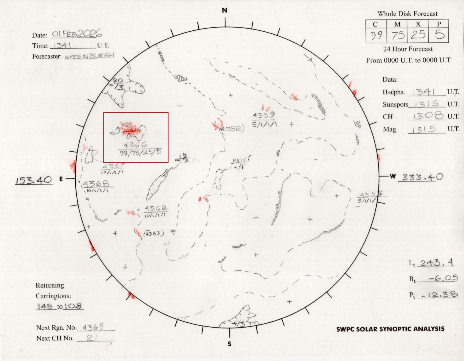 1.02.2026 года на Солнце произошли серии солнечных вспышек в одной группе черных пятен 4266. Солнечные вспышки с мощностью M 6,6 (UTC 10:02 1.02.26 г.), X 1,0 (UTC 12:34 1.02.26 г.), X 8,1 (UTC 23:50 1.02.26 г.), X 2,8 (UTC 00:36 2.02.26 г