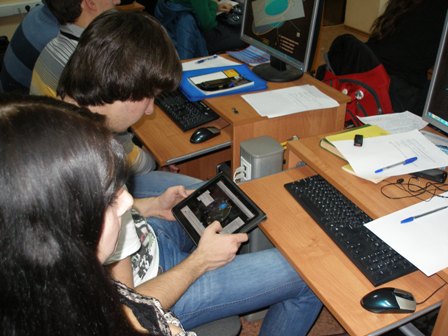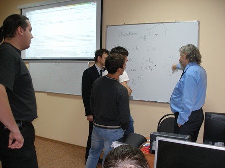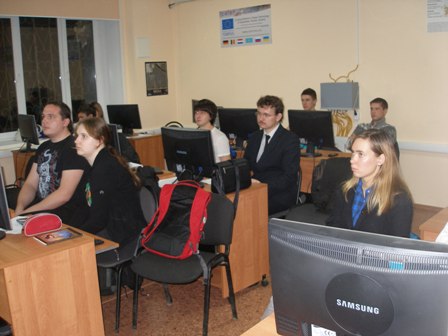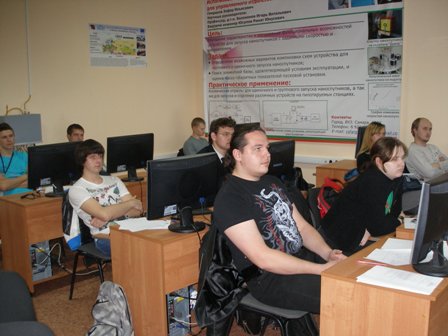 Аудитория, в которой проходят лекции, очень хорошо оборудована благодаря усилиям заведующего Межвузовской кафедрой космических исследований (в которую входит Лаборатория УлГУ) Белоконова Игоря Витальевича. Каждое место оборудовано компьютером с выходом в интернет, проектор проецирует на экран и синхронно на каждый монитор презентацию. Но главное, - это те ребята, которые сидят за компьютерами.