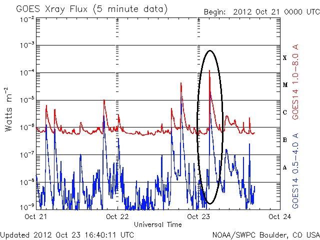23.10.2012 года в 03:16 UTC на Солнце произошла вспышка класса Х 0.3. Ожидается сильное геомагнитное возмущение Земли. Магнитная буря от Солнца достигнет нашей Земли примерно 24-25 октября 2012 года.