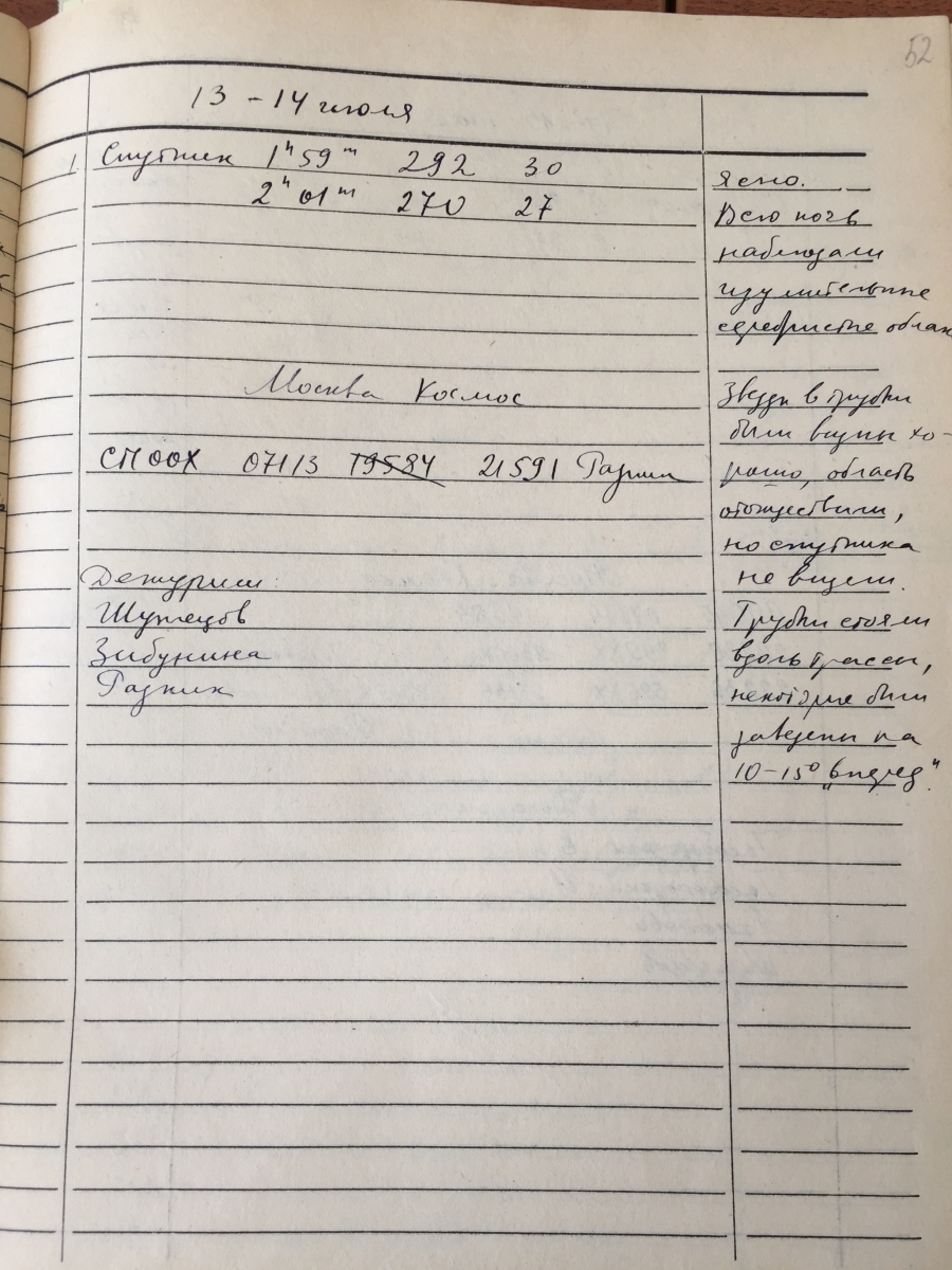В ночь с 15 на 16 июля 1959 г.: «Наблюдали полярное сияние с 11 ч 20 мин. вечера (уже было видно хорошо) до 12 ч 30 мин. (Сева описал его более подробно). Видимость звезд очень хорошая. Первый пролет спутника проходил ниже линии, указанной в эфемеридах. Спутник переменного блеска» (фото 5). Наблюдения закончились в четвертом часу ночи, а их результаты еще надо обработать и сообщить в «Космос».