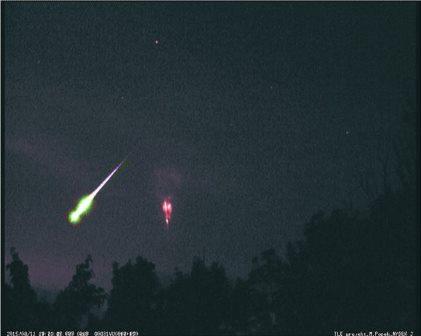 Чуть ранее пика, 11 августа 2015 года яркий болид из потока Персеиды на фоне красного спрайта был снят в Чехии, автор фото: Matin Popik.