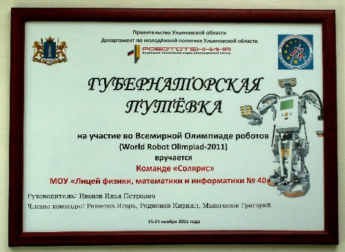 Вчера в лицее №40 состоялось выездное заседание Правительства Ульяновской области. На него были приглашены старшие соляристы, вошедшие в сборную России на Всемирную робототехническую олимпиаду (г.Абу-Даби, Объединённые Арабские Эмираты): Григорий Макогонюк, Родионов Кирилл, Айдаров Владислав и Решетов Игорь. Губернатор С.И.Морозов торжественно вручил им путёвку на Олимпиаду, оплаченную Правительством области.