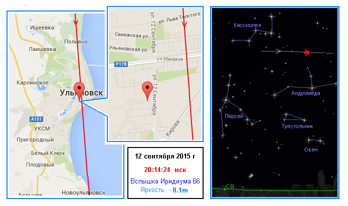 Сегодня, 12 сентября 2015 года, в 20 час. 14 мин. 24 сек. в Ульяновске вблизи улиц, указанных на карте города, можно увидеть ярчайшую вспышку от одного из космических спутников Иридиум в восточной части неба.