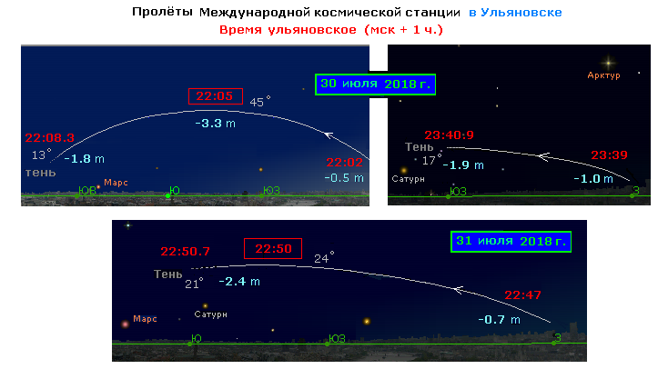 Первый (из двух вечерних) пролёт МКС 26 июля в 22:20 - последний из самых высокихх и ярких над Ульяновском в этой серии. Второй пролёт в 23:56 - ниже и слабее, и после кульминации входит в тень.