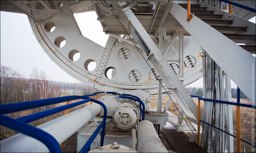 4. Но самое интересное находится внутри радиотелескопа, а именно — в его основании. На самом деле основание телескопа это поворотный лафет от корабельного орудия, с недостроенного и разобранного линкора.