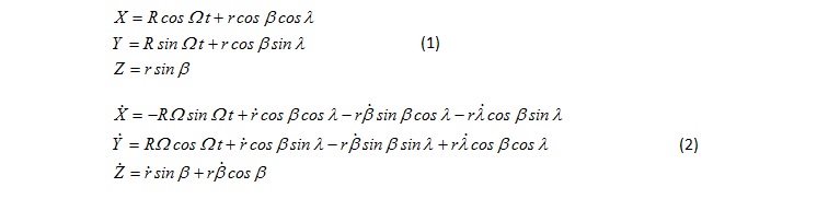Рассмотрим ограниченную круговую задачу трех тел в трехмерном пространстве (три степени свободы, три обобщенные координаты). Пусть Земля движется строго по окружности (Рис 1.) Выразим гелиоцентрические координаты и соответствующие компоненты скорости Луны через углы ее прямого восхождения и склонения: