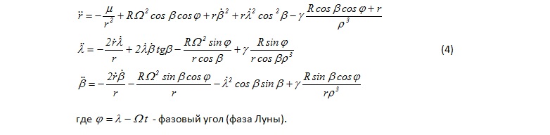 Уравнения движения можно получить, составив уравнения Лагранжа второго рода. Выражение для потенциальной энергии (отнесенной к массе Луны) очевидно и лаконично: