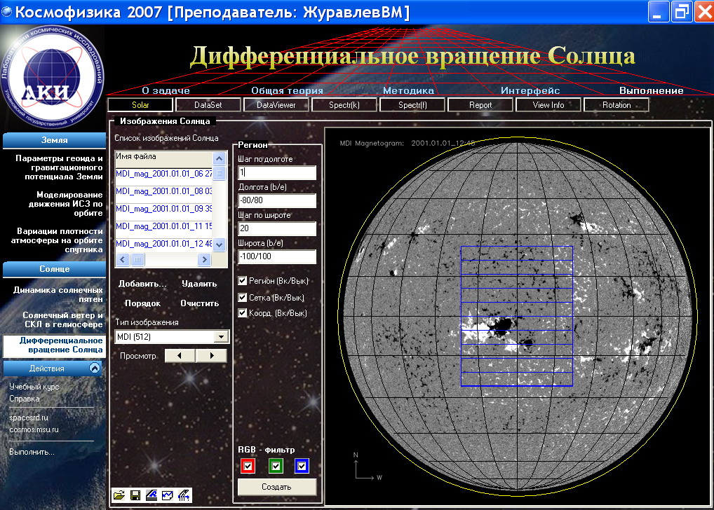 Screenshots of practise course in Space Physics Kosmophysika-2007 ("The Sun" chapter)