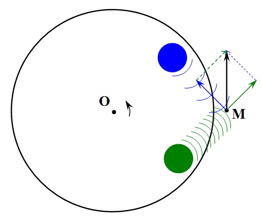 Из неё видно, что результирующая сила (чёрная стрелка) от действия потенциалов двух частей диска (зелёной - набегающей и синей - убегающей) на тело М направлена почти по касательной к вращающемуся диску, т.е., Ваш потенциал вращающегося диска как бы "увлекает" за собой находящиеся рядом объекты, а не притягивает их с экваториальных направлений, как Вы пишете.