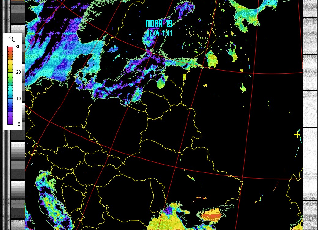 NOAA-19 Композитное изображение. (Температура поаерхности моря) (Обрезаны области с шумом)