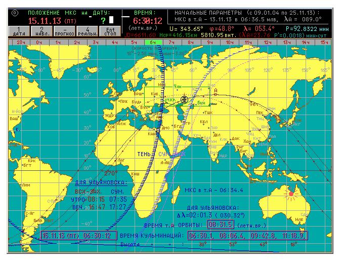 На этой карте показан один из первых утренних пролётов МКС вблизи Ульяновска около 6:30 мск 15/11/2013. Подробные комментарии этого невидимого из-за погоды у нас пролёта и примерный график до конца периода - в последующих заметках.